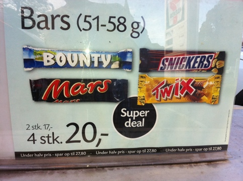 Flot træk fra en af de mest sundheds tænkende virksomheder i Danmark!! Et hurtigt stop på en tankstation med 7- eleven apendix. Hvem helvede har brug for at købe 4 gange dagsration i energi og hvem helvede tror på at man kan arkivere dem i handskerummet uden at spise det hele inden for 25 minutter??!! Hvis du hopper på sådan en finte har du virkelig brug for at komme ind i kampen!!
